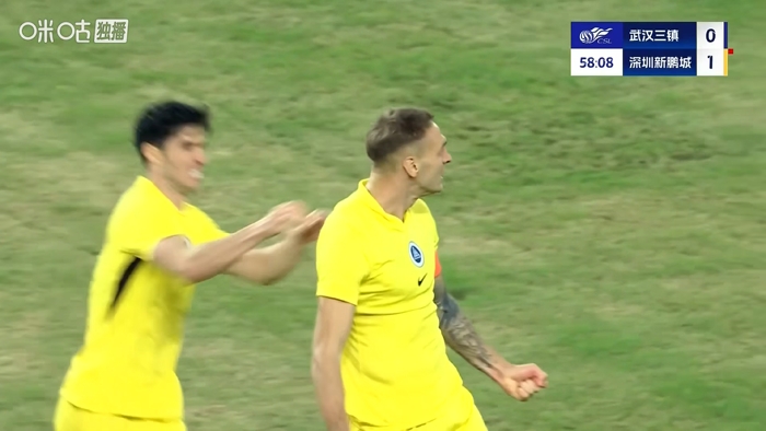 10月24日讯 中超第28轮,武汉三镇vs深圳新鹏城。比赛第58分钟,杜加利奇包抄破门,10人新鹏城客场2-0领先三镇!VAR长时间核实后认定进球有效。